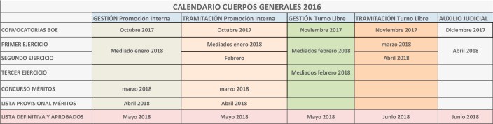 OEP 2016: Publicación en el BOE de las convocatorias de Gestión y Tramitación, turno libre, a finales de noviembre o primeros días de diciembre de 2017; la convocatoria de Auxilio se publicaría en el BOE en diciembre de 2017. Recordar que los exámenes serían, según esta previsión, Gestión turno libre en febrero de 2018, Tramitación turno libre en marzo de 2018 y Auxilio Judicial en abril de 2018.