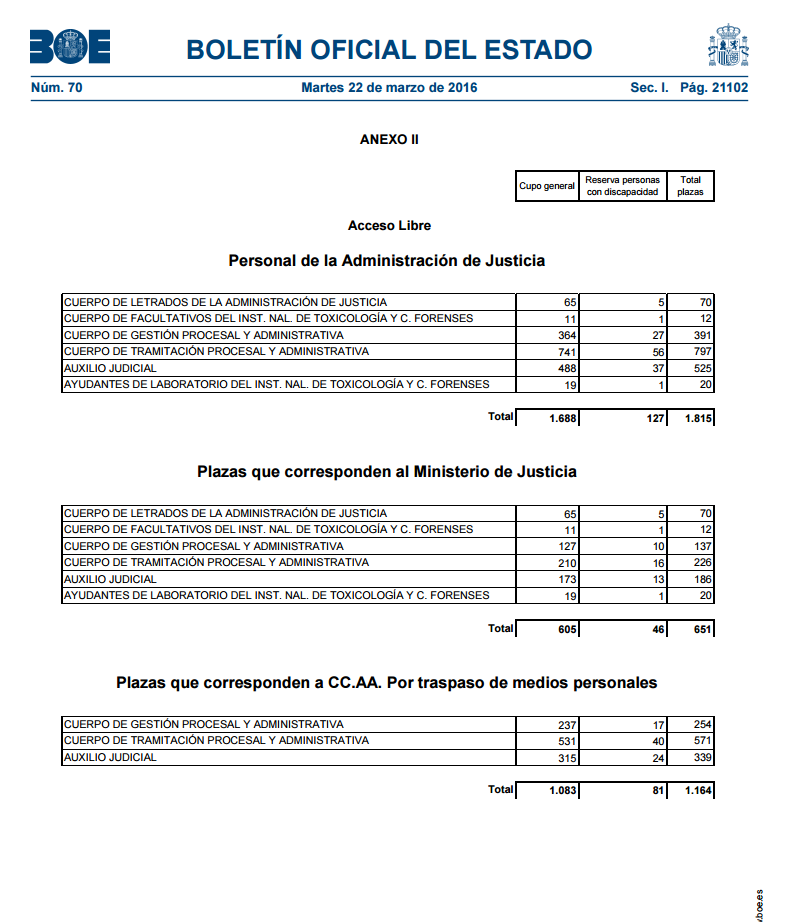 Según publica la web de CCOO, el Ministerio de Justicia ha propuesto al de Administraciones Públicas la convocatoria del 20% de las plazas vacantes en la Administración de Justicia, máximo permitido por la Ley de Presupuestos Generales para 2016, aproximadamente algo más de 2100 plazas de todos los cuerpos, que incluye tanto las del turno libre como las de promoción interna. Al mismo tiempo se efectuó un reparto entre las distintas administraciones competentes (central y autonómicas) correspondiéndole a Cataluña la cifra de 503 plazas para el turno libre, además de un 30 % para promoción interna de las de los cuerpos de Gestión y Tramitación.