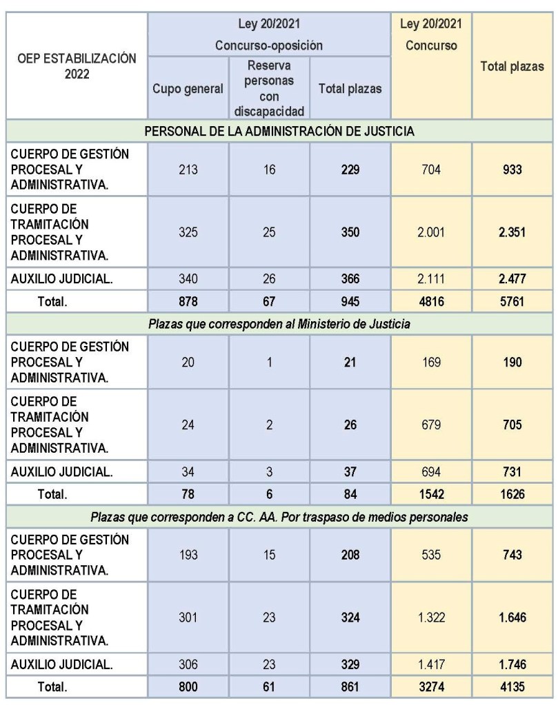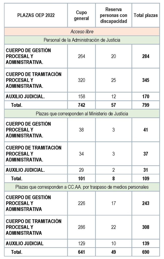 En el ámbito de la Administración de Justicia y en relación con los Cuerpos de GESTIÓN PROCESAL Y ADMINISTRATIVA, TRAMITACIÓN PROCESAL Y ADMINISTRATIVA y de AUXILIO JUDICIAL, las plazas que se han aprobado en el año 2022, son las siguientes: