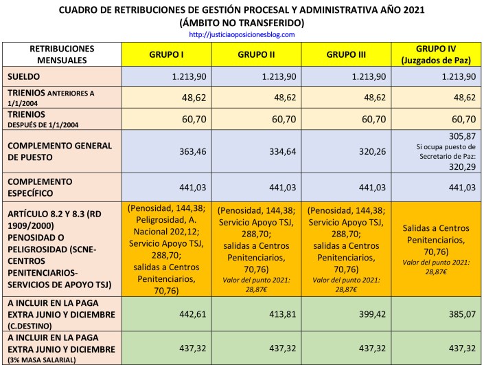 GESTIÓN PROCESAL Y ADMINISTRATIVA: La cantidad mínima inicial que puede percibir el funcionario sería de: doce pagas mensuales de, al menos, 2.175,13 € cada una, más dos pagas extras de 2.091,66 € € cada una (Grupo III de población, que son los destinos más numerosos). De estas cantidades habría que detraer IRPF, Seguridad Social y Mugeju.
