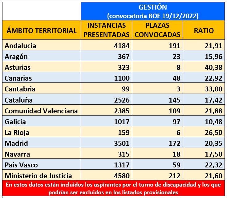Ratio de instancias presentadas para las oposiciones de Gestión, Tramitación y Auxilio Judicial (OEP 2020-2021-2022), convocada el 19 de diciembre de 2022, en todos los ámbitos territoriales