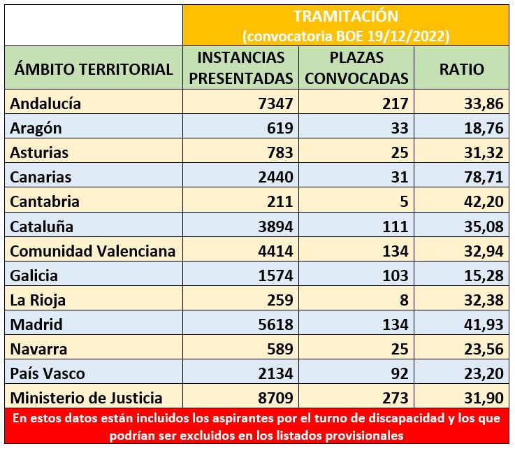 Una vez finalizado el plazo para la inscripción, el Ministerio de Justicia ha comunicado a las organizaciones sindicales el número de instancias presentadas en todos los ámbitos territoriales para la admisión en las pruebas selectivas, por el sistema de oposición, para ingresar en los Cuerpos de Gestión Procesal y Administrativa, Tramitación Procesal y Administrativa y Auxilio Judicial, de la Administración de Justicia, convocadas por Orden JUS/1254/2022, publicada en el BOE el 19 de diciembre de 2022.
