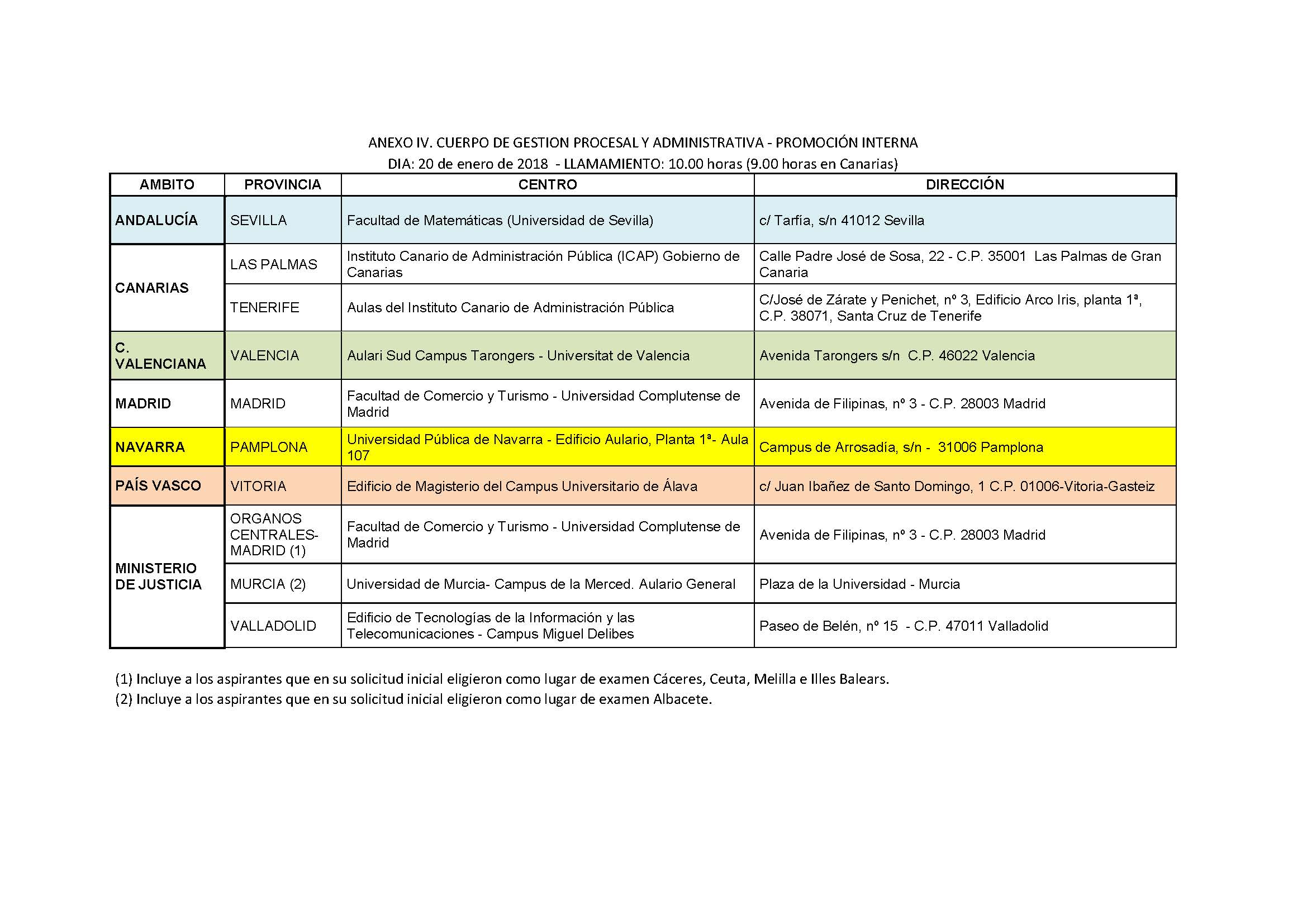 Se confirma que la celebración del primer ejercicio del proceso selectivo del Cuerpo de Gestión Procesal y Administrativa de la Administración de Justicia, acceso por promoción interna, convocado por la Orden JUS/930/2017, de 19 de septiembre, tendrá lugar el próximo día 20 de enero de 2018, a las 10:00 horas (9:00 horas en Canarias), en los lugares que se relacionan en el anexo que figura a continuación.