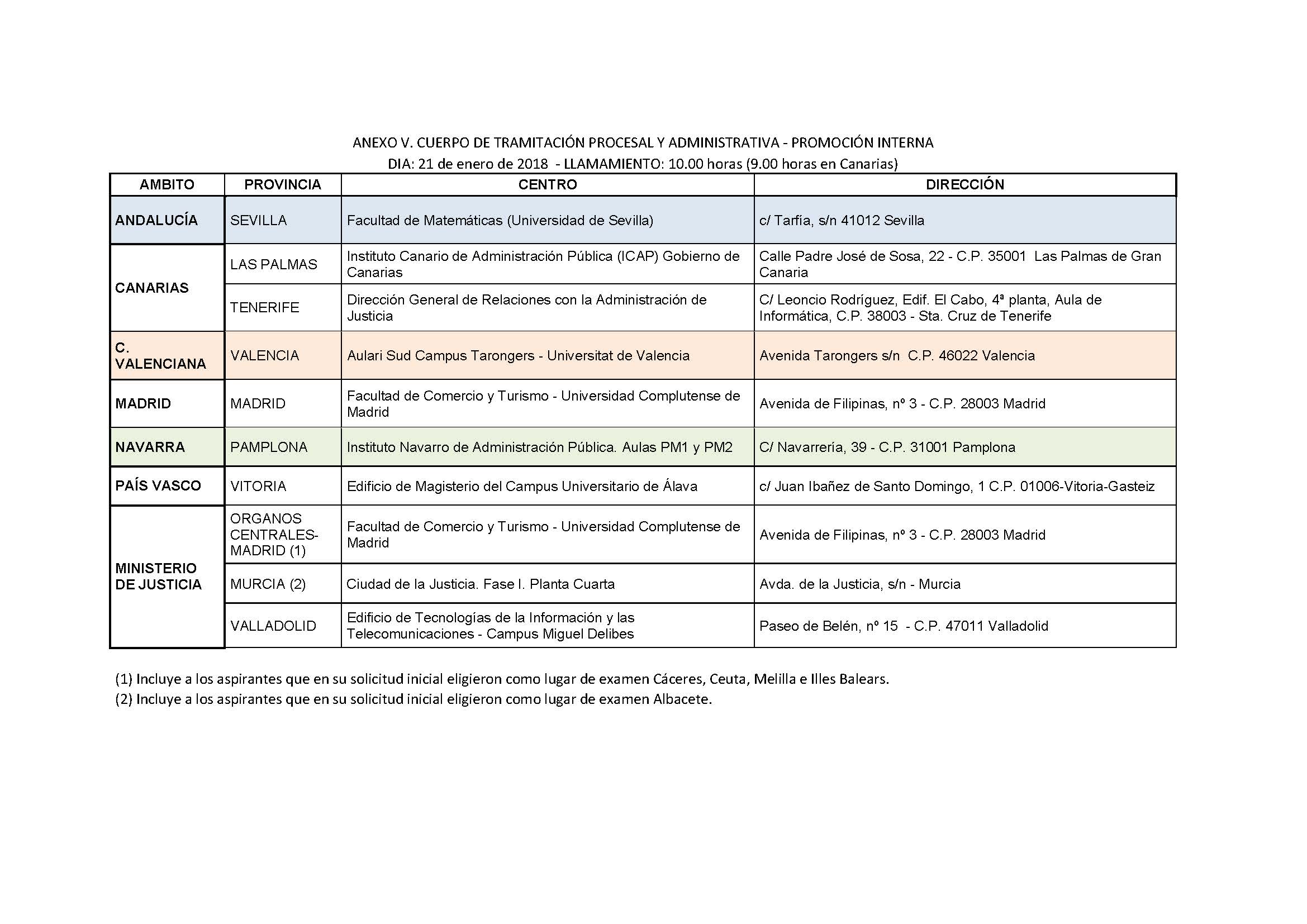 Cuerpo de Tramitación Procesal y Administrativa, el próximo día 21 de enero de 2018, a las 10.00 horas (9.00 horas en Canarias), en los lugares que se relacionan en el Anexo V.